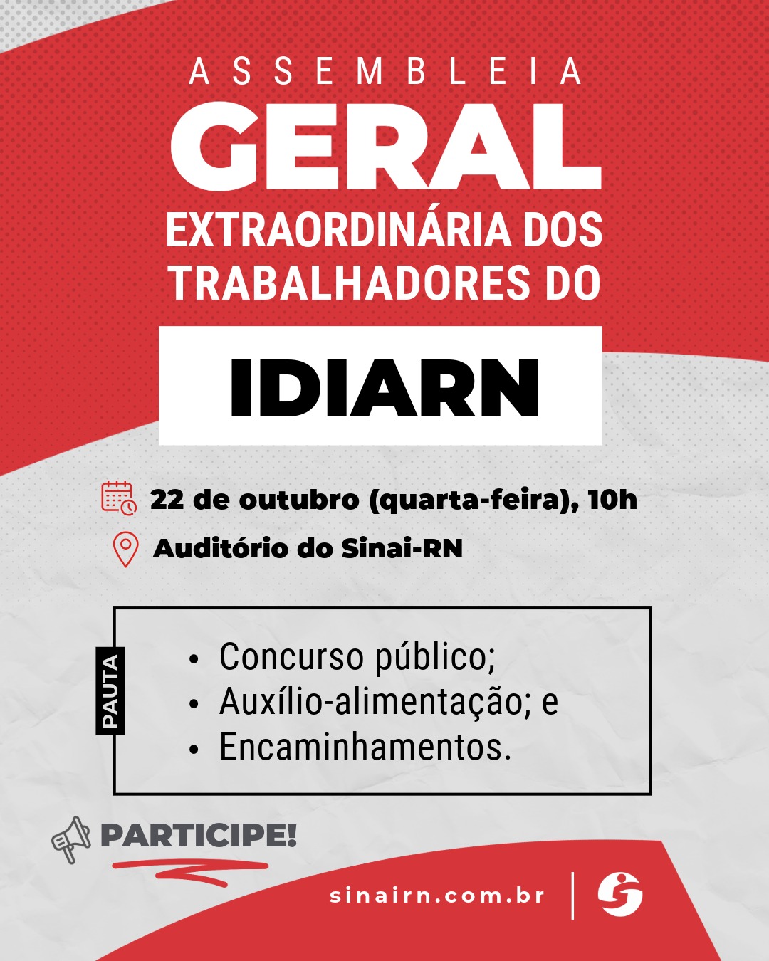 O Sinai-RN convoca os trabalhadores do Idiarn para Assembleia Geral Extraordinária no dia 22 de outubro (terça-feira), às 10h, no auditório do Sindicato. Inicialmente, essa atividade aconteceria em 21 de outubro, mas foi reagendada.