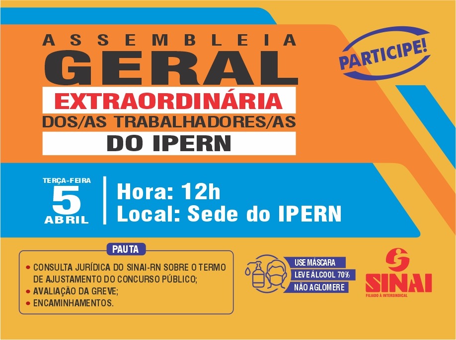 A Assembleia dos trabalhadores do IPERN agendada para esta terça-feira (05) vai pautar uma consulta jurídica que o SINAI-RN vai fazer sobre o Termo de Ajustamento de Conduta (TAC) que pode viabilizar a realização de um concurso na Autarquia. O encontro da categoria convocado pelo Sindicato acontece às 12h, na sede do Instituto.