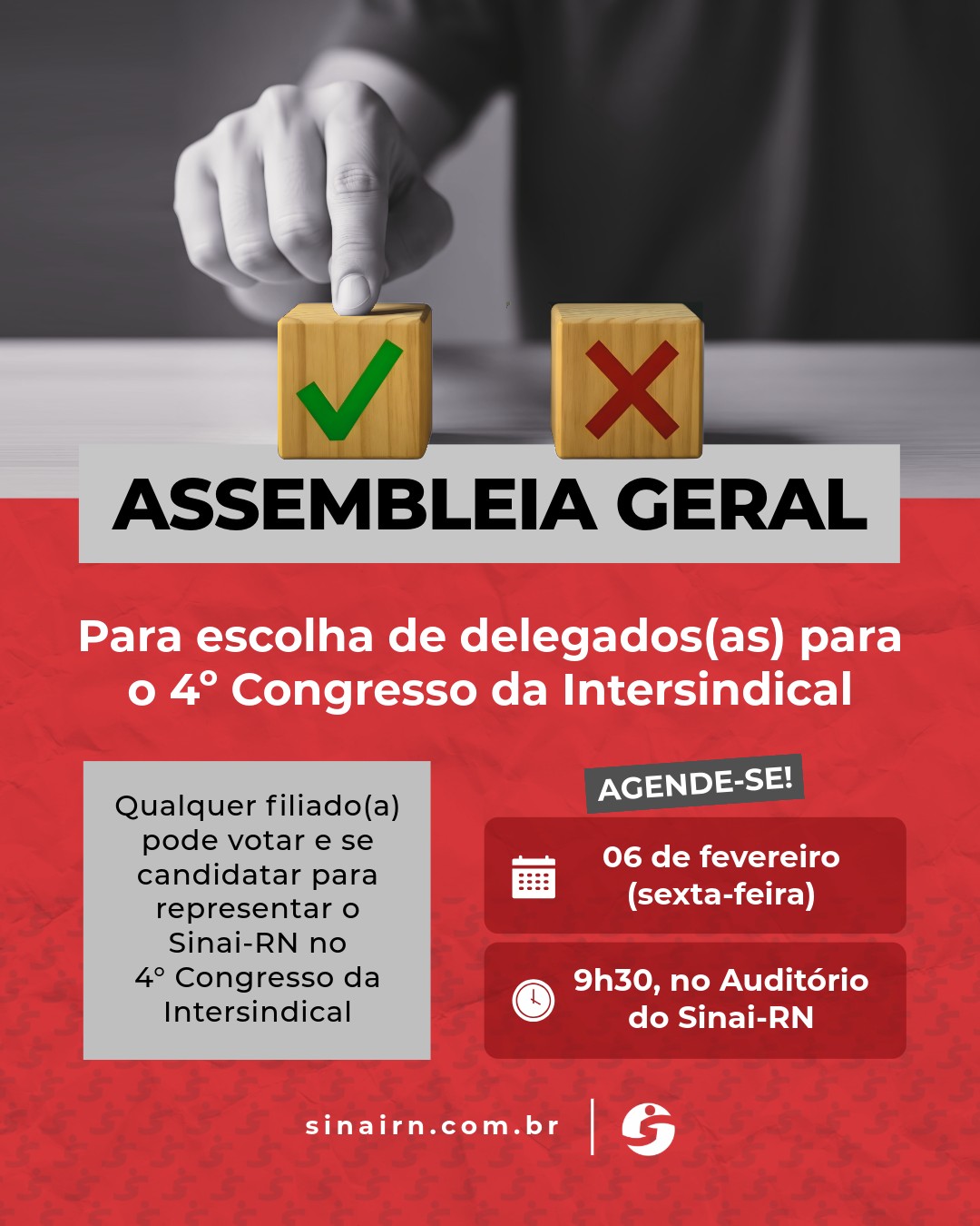 Os trabalhadores que vão representar o Sinai-RN no 4º Congresso da Intersindical serão escolhidos durante Assembleia Geral Extraordinária convocada para 6 de fevereiro. O encontro ocorre às 9h30, no auditório da sede estadual do Sindicato, em Natal.