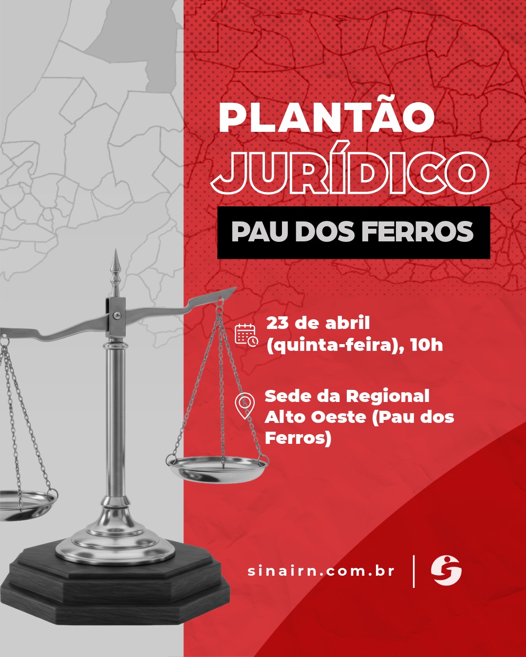O Sinai-RN leva à Regional Alto Oeste mais uma rodada de atendimento jurídico presencial voltado aos filiados. A atividade será realizada no dia 23 de abril (quinta-feira), a partir das 10h, em Pau dos Ferros.
