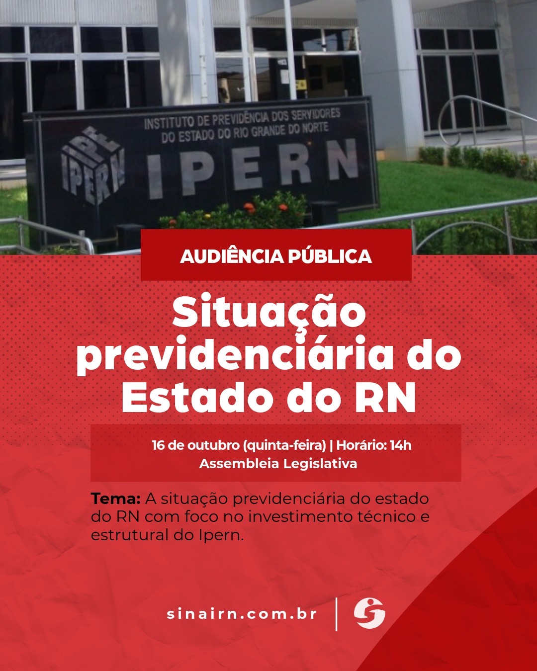 Na próxima quinta-feira, 16 de outubro, às 14h, será realizada na Assembleia Legislativa do Rio Grande do Norte uma audiência pública para discutir a situação previdenciária do Estado, com destaque para as condições do Instituto de Previdência dos Servidores Estaduais (Ipern).