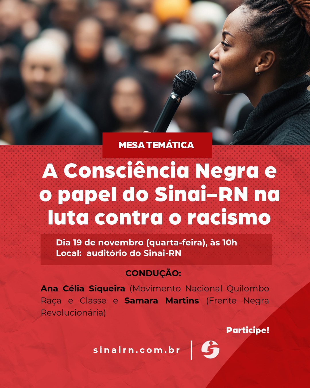 Em alusão ao mês da Consciência Negra, será realizada no dia 19 de novembro (quarta-feira), às 10h, no auditório do Sinai-RN, a Mesa Temática e Roda de Conversa “A Consciência Negra e o papel do Sinai-RN na luta contra o racismo”.