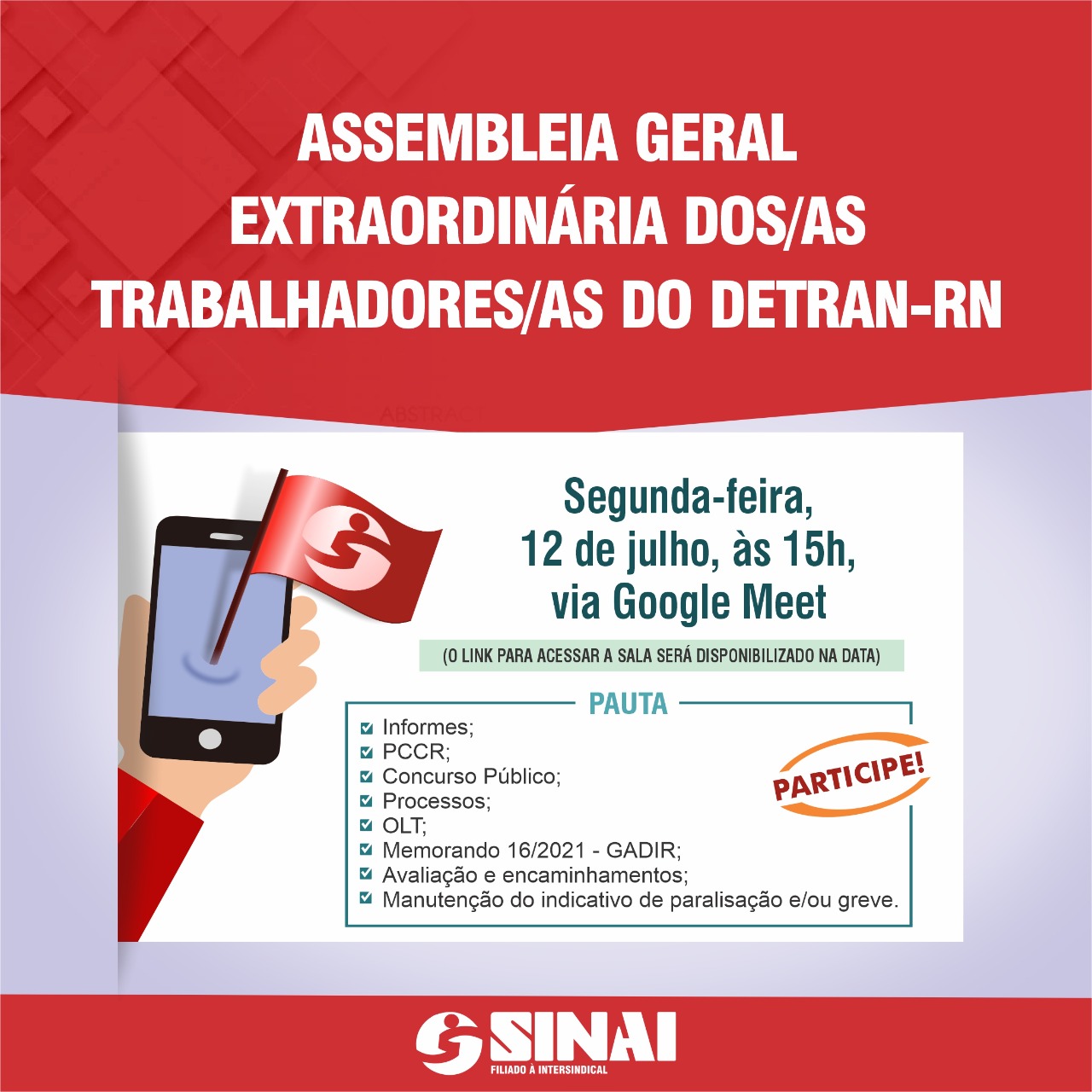 A direção do SINAI-RN está convocando os trabalhadores e trabalhadoras do DETRAN para mais uma Assembleia Geral virtual. O encontro acontece em 12 de julho (segunda-feira), às 15h, pelo Google Meet. O link para acessar a sala será disponibilizado pelo Sindicato na data.