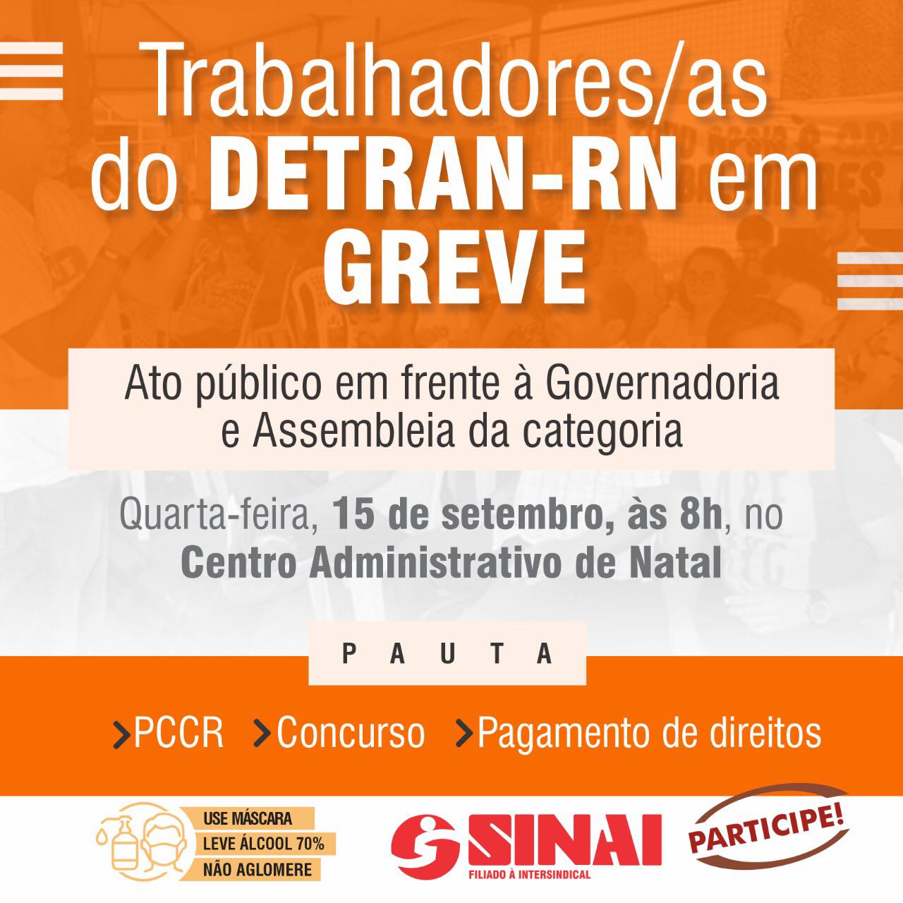 Iniciando a terceira semana de greve, os trabalhadores e trabalhadoras do DETRAN-RN realizam um novo Ato Público em frente à Governadoria, no Centro Administrativo de Natal. A atividade acontece na manhã da quarta-feira, 15 de setembro, a partir das 8h.