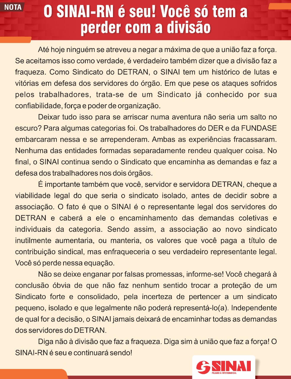 Em nota, SINAI-RN chama atenção dos/as trabalhadores/as do DETRAN para os riscos da divisão de forças no Departamento 11 de agosto de 2021 / Detran