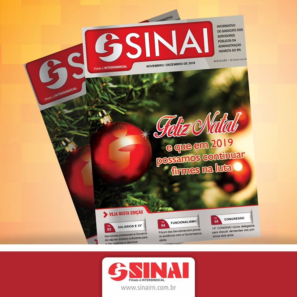 A edição de novembro/dezembro de 2018 do Jornal do SINAI-RN destaca em sua capa a luta dos servidores, encampada pelo Fórum Estadual, para receber o salário e o 13° em dia.