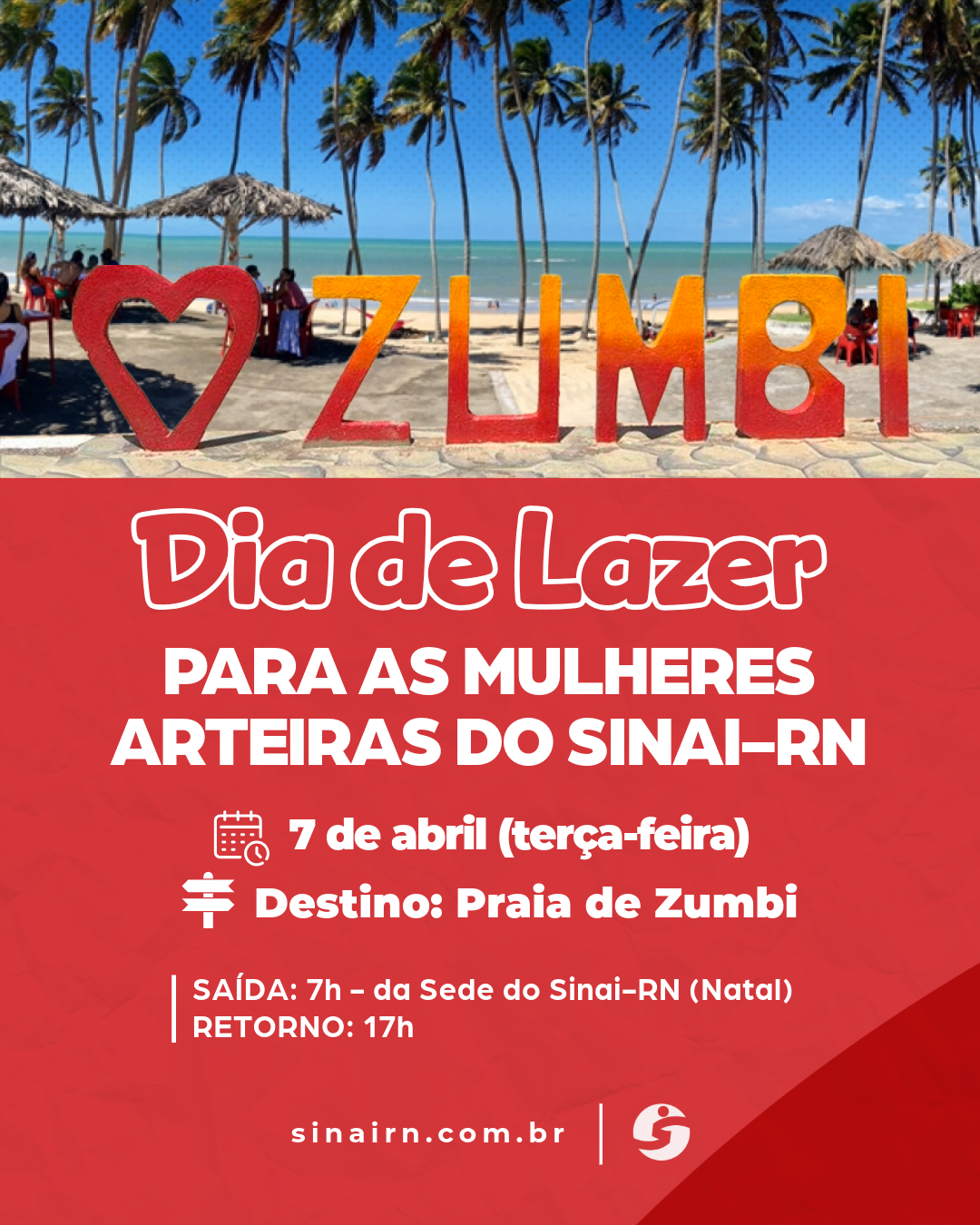 O passeio será realizado na praia de Zumbi, no litoral norte do estado. A saída está prevista para as 7h, da sede estadual do sindicato, localizada na Av. Leonardo Drumond, 1661, em Lagoa Nova, com retorno à capital às 17h. O transporte será feito por meio de van fretada pela entidade.