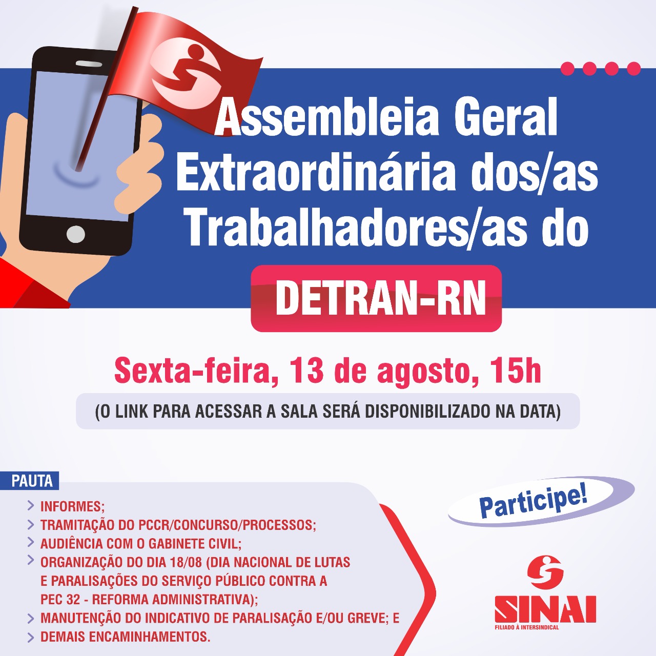 Os trabalhadores e trabalhadoras do DETRAN são convocados pra uma nova Assembleia Geral Extraordinária. A atividade é coordenada pelo SINAI-RN e vai acontecer em formato remoto na próxima sexta-feira, 13 de agosto, às 15h. O link de acesso será encaminhado posteriormente.