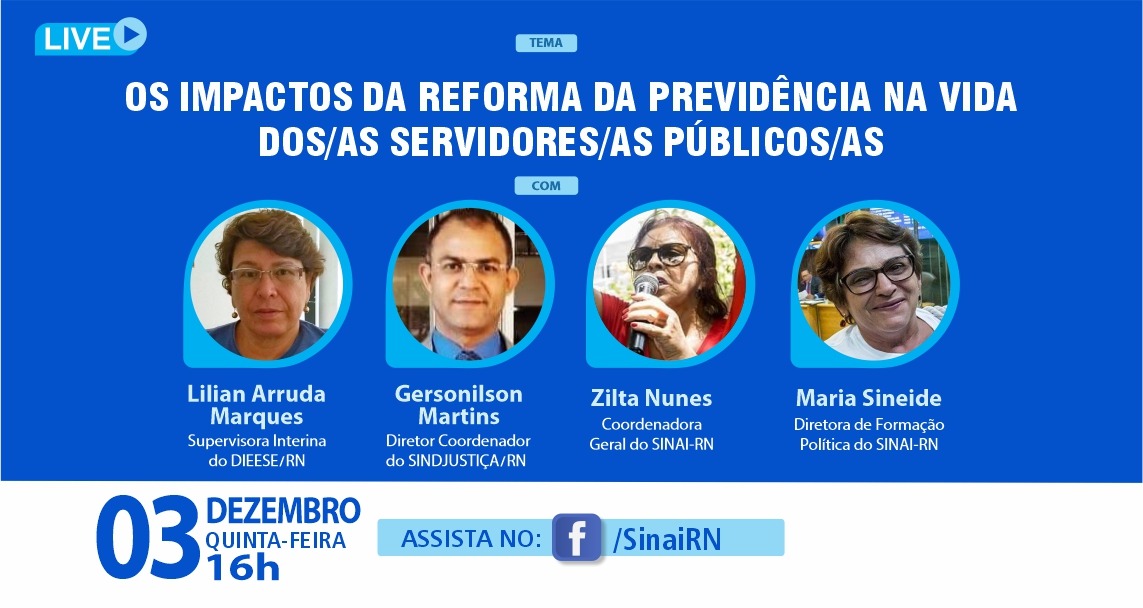 Com a proximidade de 2021 – quando passam a valer as novas regras da previdência estadual – o SINAI-RN promove uma live sobre os impactos da Reforma Previdenciária na vida dos/as servidores/as. A live acontece na tarde da quinta-feira, 03 de dezembro, às 16h.
