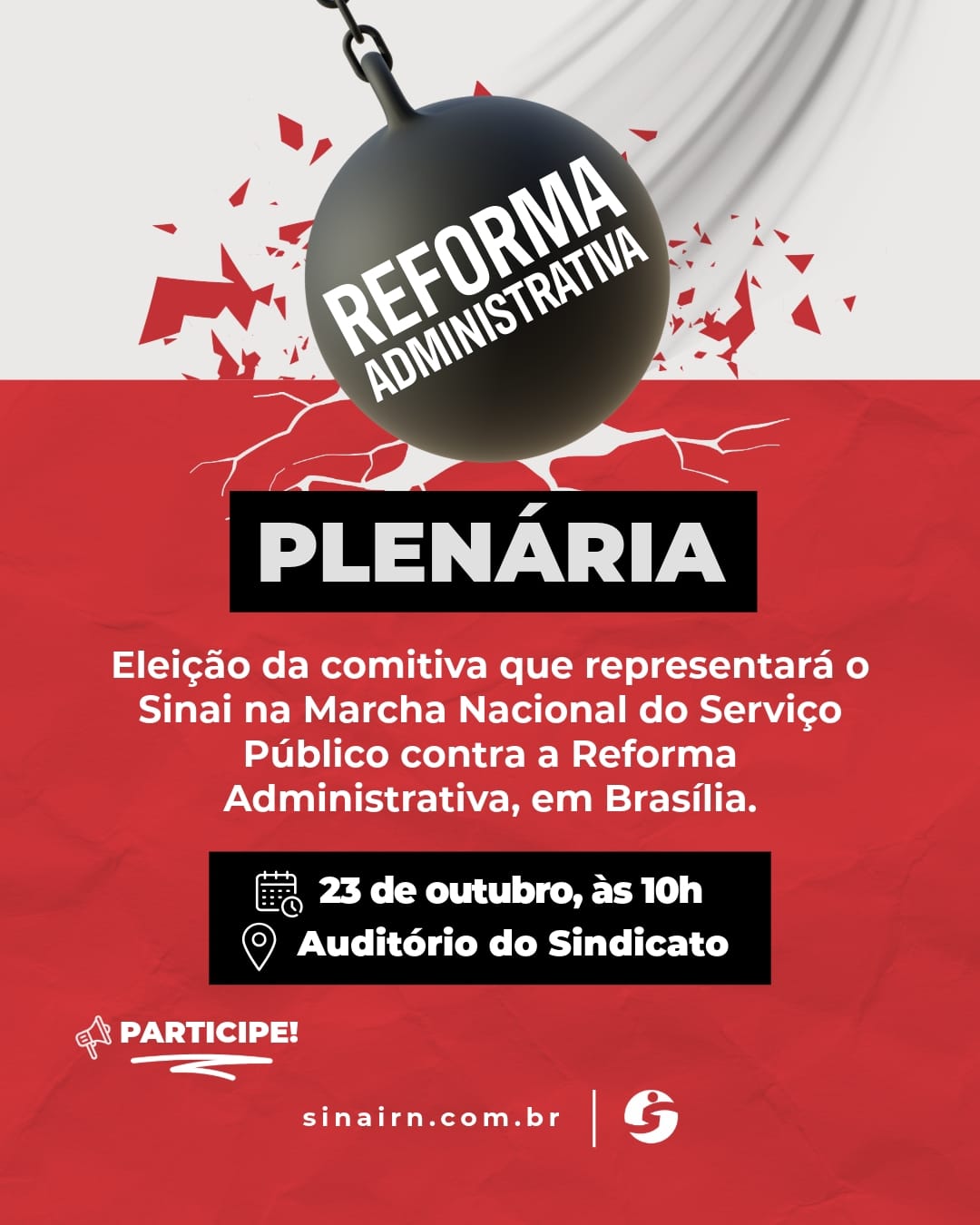 O Sinai-RN convoca os servidores de sua base para participar da plenária que vai eleger a comitiva que representará o Sindicato na Marcha Nacional do Serviço Público contra a Reforma Administrativa, em Brasília (DF).