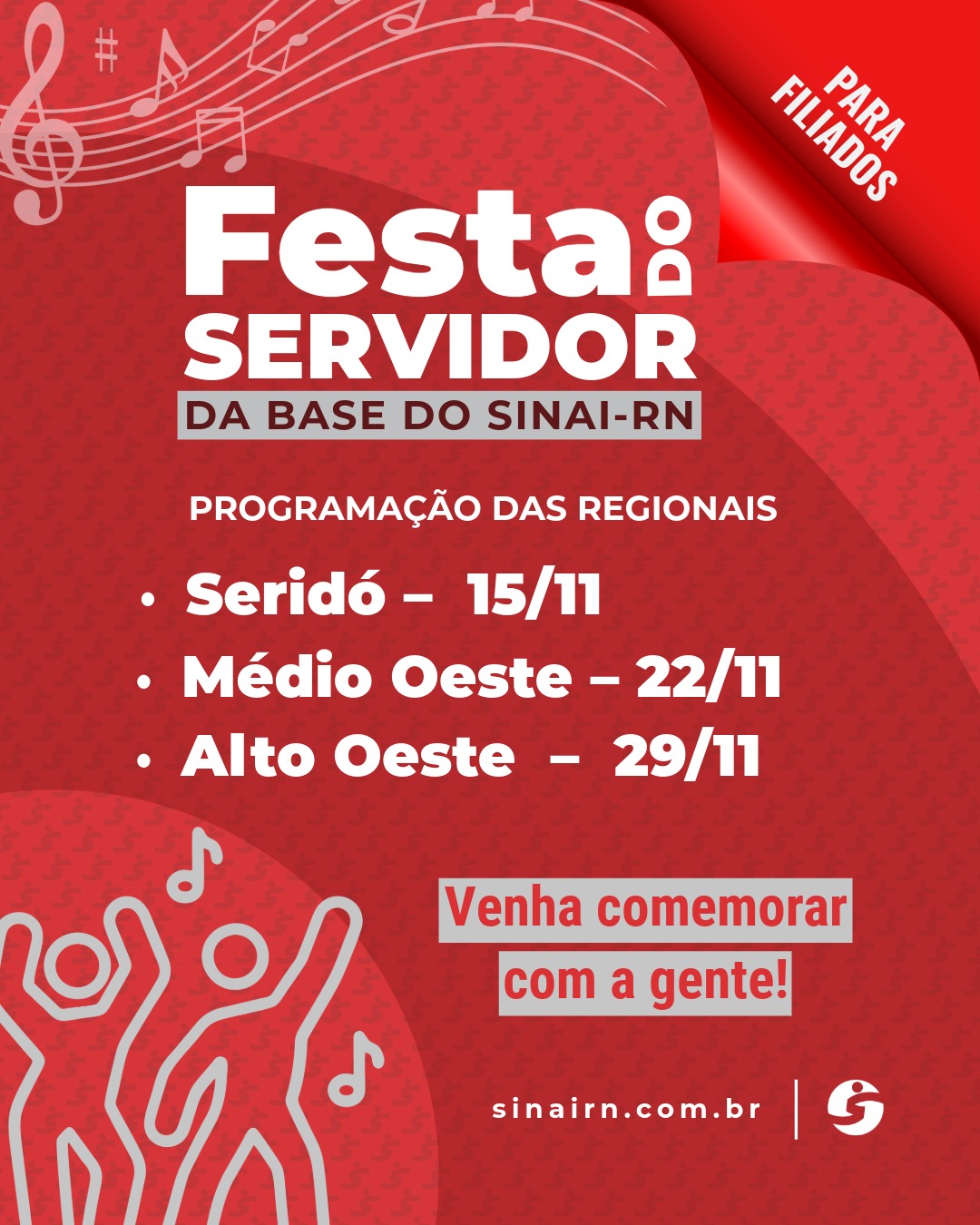As Regionais Seridó, Médio Oeste e Alto Oeste do Sinai-RN vão promover, neste mês de novembro, as tradicionais Festas do Servidor da base do Sindicato. Os eventos, voltados exclusivamente para filiados e seus dependentes, reúnem lazer, confraternização e música ao vivo em diferentes cidades do interior do estado.