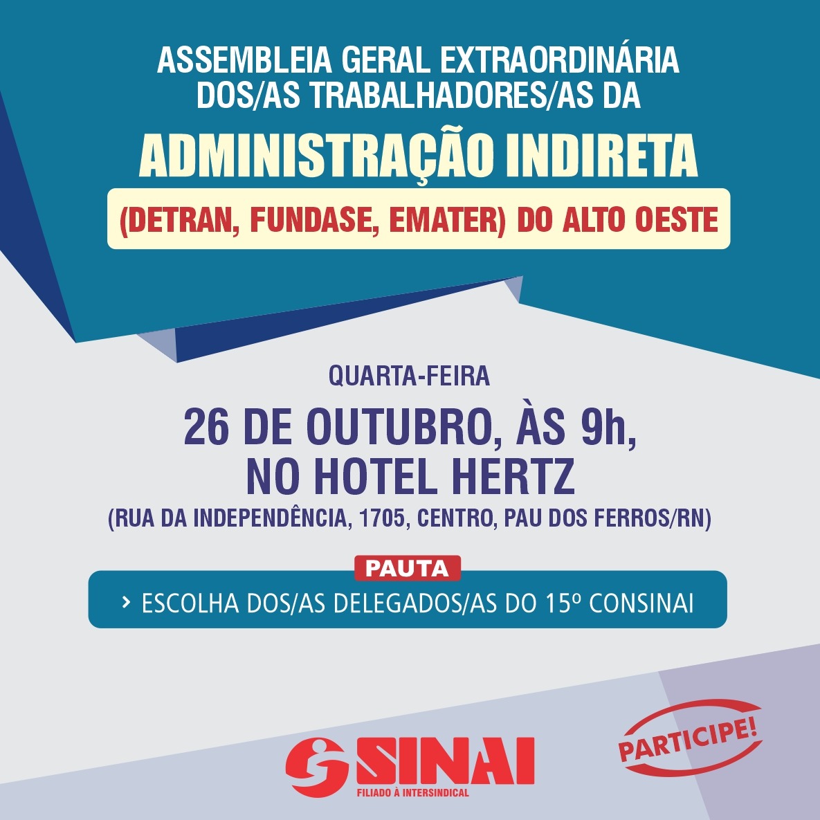 A Regional Alto Oeste (Pau dos Ferros) do SINAI-RN realiza na próxima quarta-feira, dia 26 de outubro, Assembleia Geral Extraordinária dos/as trabalhadores/as da Administração Indireta pertencentes aos quadros do DETRAN, FUNDASE e EMATER.