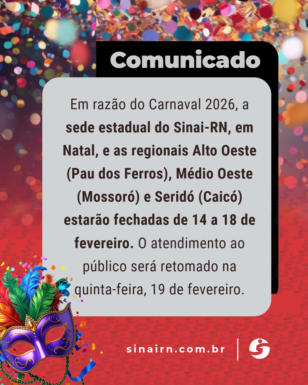 Em razão do Carnaval 2026, a sede estadual do Sinai-RN, em Natal, e as regionais Alto Oeste (Pau dos Ferros), Médio Oeste (Mossoró) e Seridó (Caicó) estarão fechadas no período de 14 a 18 de fevereiro.