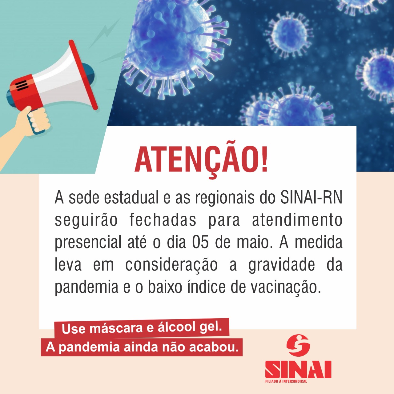 A sede estadual do SINAI-RN, em Natal, e as regionais do Sindicato, localizadas em Caicó, Pau dos Ferros e Mossoró, permanecerão fechadas para atendimento presencial até pelo menos o dia 05 de maio. A decisão foi tomada pela diretoria da entidade durante reunião virtual na tarde da segunda-feira (26/04) e leva em conta a gravidade da pandemia no Estado e o baixo índice de vacinação.