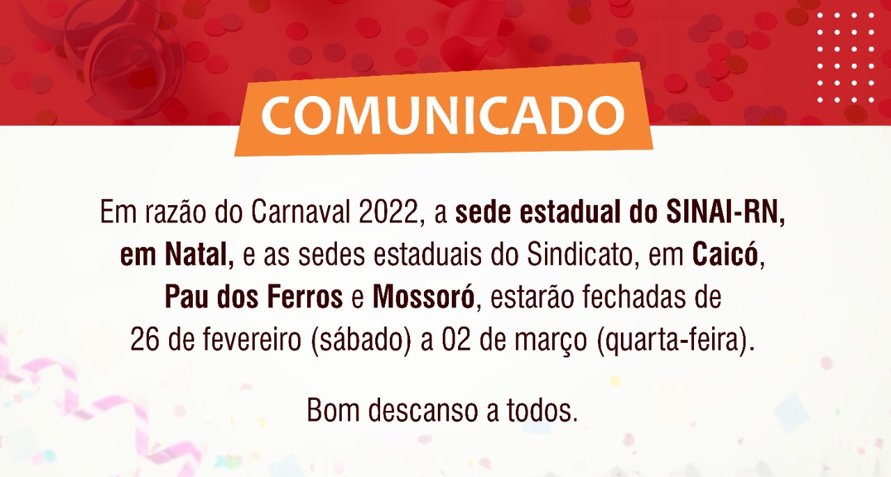 Sede estadual do SINAI-RN e regionais reabrem na quinta (03) pós-carnaval 25 de fevereiro de 2022 / Gerais