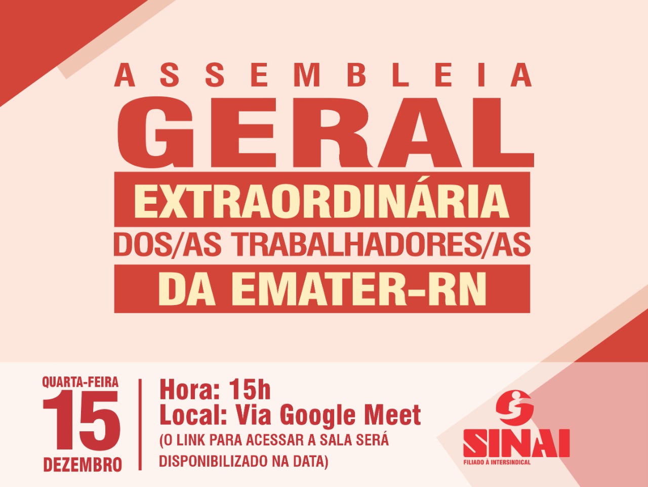 Os servidores do Instituto de Assistência Técnica e Extensão Rural (EMATER) estão sendo convocados para Assembleia Geral Extraordinária. O encontro acontece nessa quarta-feira (15), às 15h, via Google Meet. O link para acessar a sala será disponibilizado na data.
