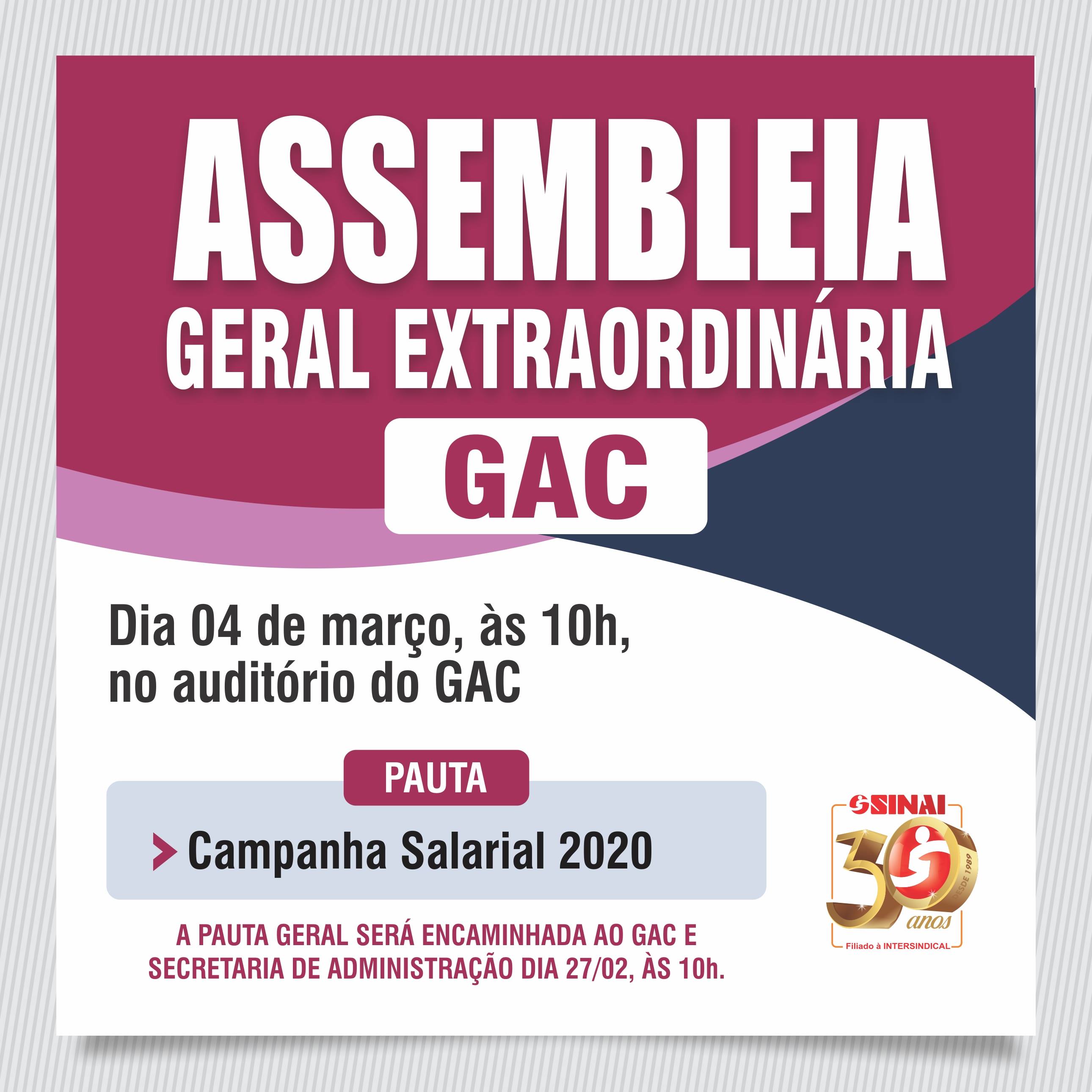 A Assembleia com os/as servidores/as do GAC acontece no dia 04 de março (quarta-feira), às 10h, no auditório do GAC.