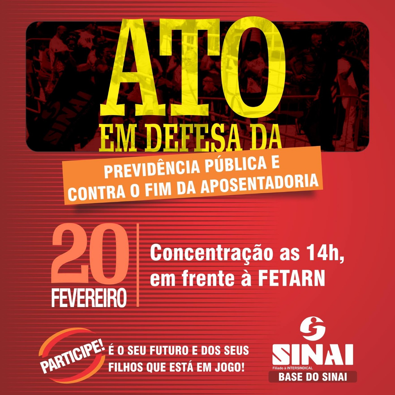 Dia 20 de fevereiro, as centrais sindicais estão convocando um ato em da Defesa da Previdência Pública e Contra o Fim da Aposentadoria. O ato terá início às 14h, com concentração na FETARN, em seguida com mobilização com caminhada pelas ruas do centro de Natal. A atividade se encerra na sede do INSS da rua Apodi (Casa da Dinda).