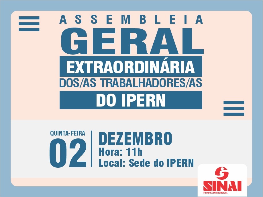 Nesta quinta-feira, 02 de dezembro, os trabalhadores do Instituto de Previdência Dos Servidores Estaduais (IPERN) deverão se reunir em Assembleia Geral convocada pela direção do SINAI-RN. O encontro acontece a partir das 11h, na sede do Instituto.