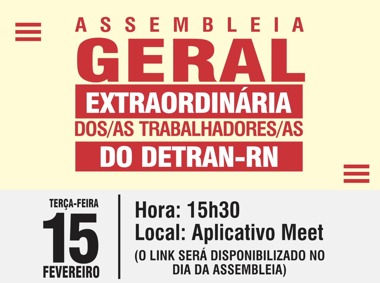 A direção do SINAI-RN convocou mais uma Assembleia Geral Extraordinária dos/as trabalhadores/as do Departamento Estadual de Trânsito (DETRAN-RN). O encontro está agendado para ocorrer em 15 de fevereiro (terça-feira), às 15h30, pelo aplicativo Google Meet. O link para acessar a plataforma será disponibilizado no dia da atividade.