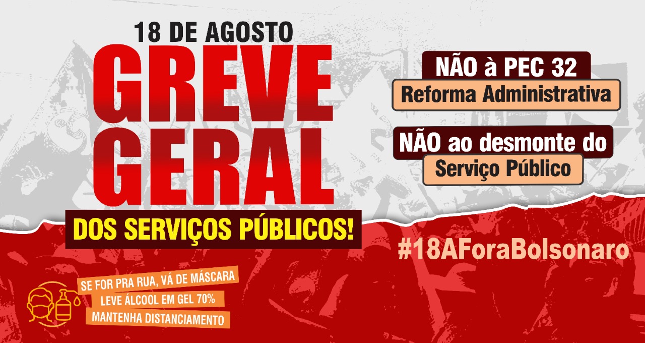18 de agosto é Dia de Greve Geral dos Serviços Públicos. A data será marcada por mobilizações nas ruas e nas redes sociais contra a Reforma Administrativa (PEC 32) proposta pelo Governo Federal.