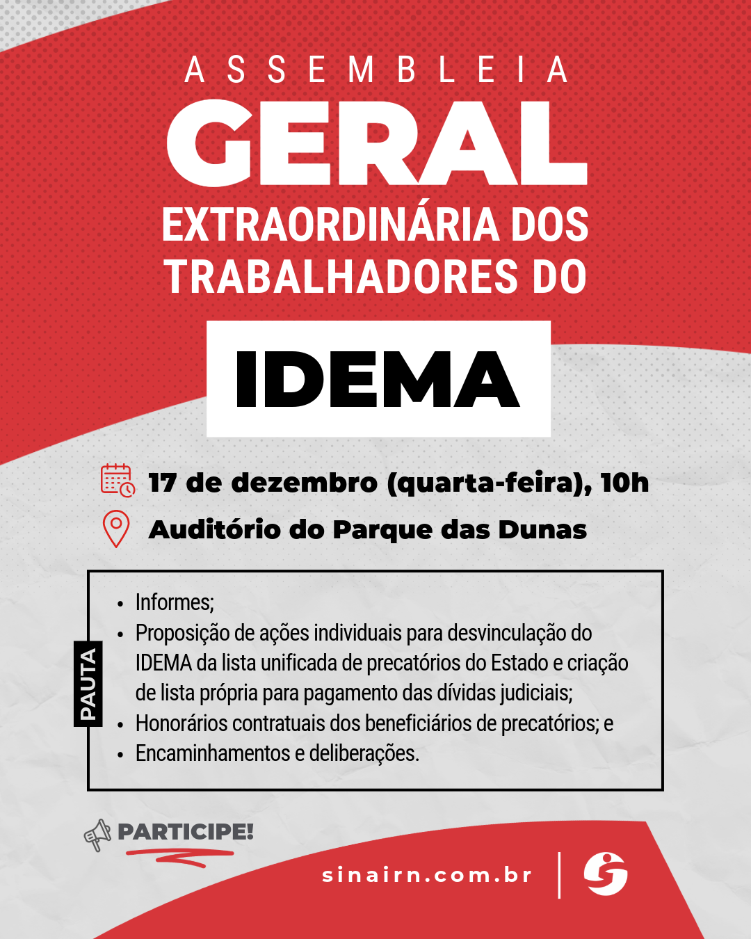 O Sinai-RN convoca os servidores do Instituto de Desenvolvimento Sustentável e Meio Ambiente (Idema) para Assembleia Geral Extraordinária no dia 17 de dezembro (quarta-feira), às 10h, no Auditório do Parque das Dunas, localizado na Av. Alm. Alexandrino de Alencar, no bairro Tirol.