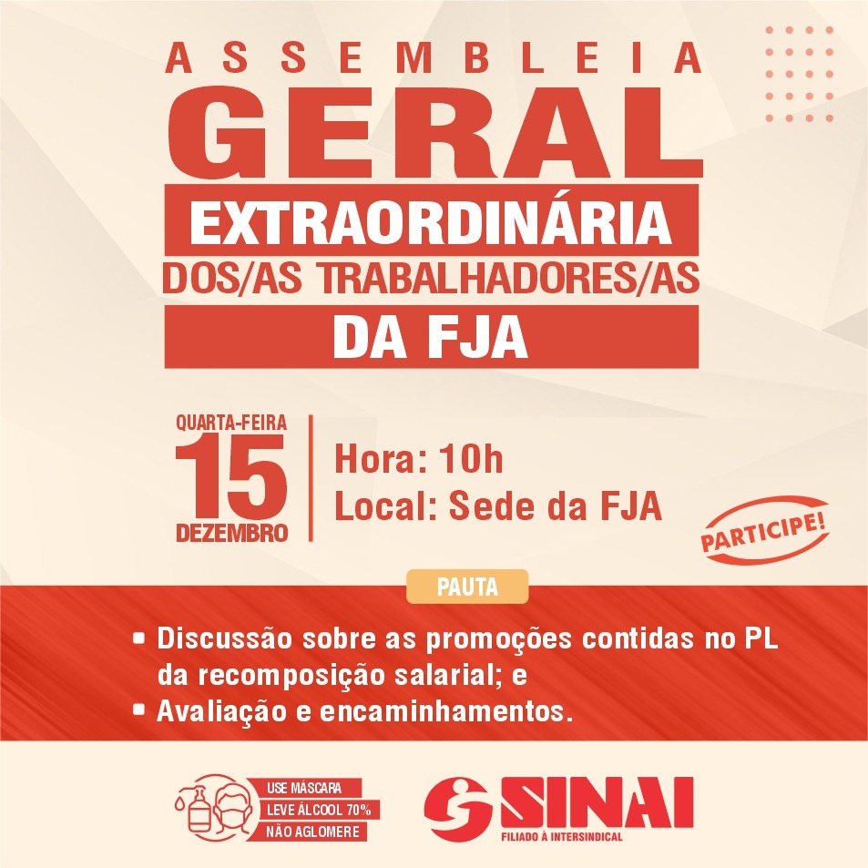 O SINAI-RN convoca os trabalhadores e as trabalhadoras da Fundação José Augusto (FJA) para Assembleia Geral Extraordinária da categoria. A atividade vai ser realizada na quarta-feira (15/12), 10h, na sede da Fundação.