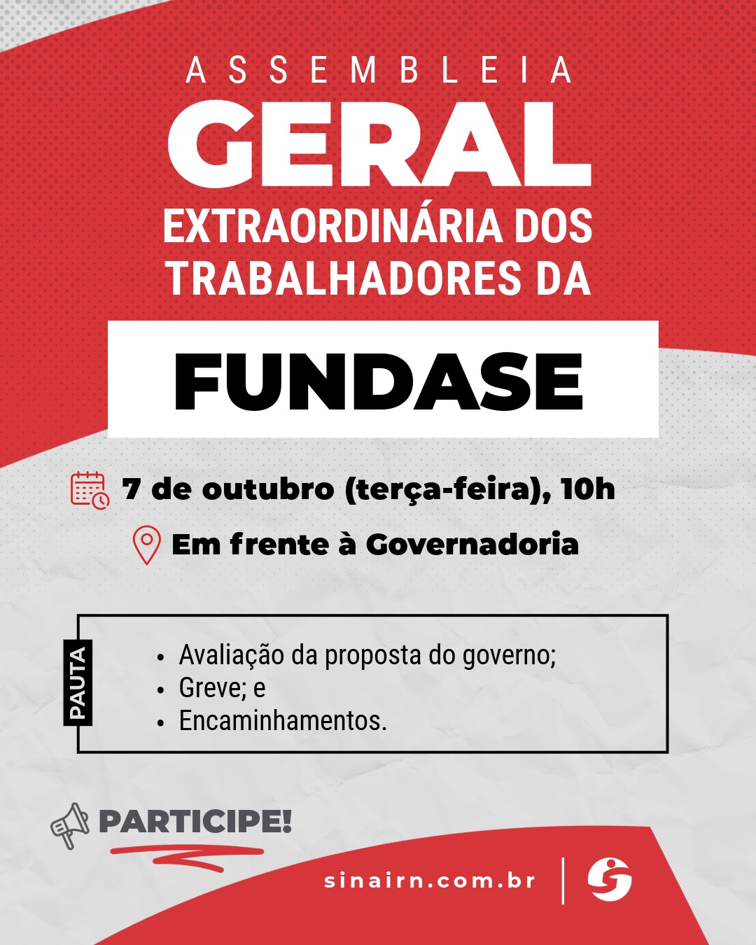 O Sinai-RN convoca os(as) trabalhadores(as) da Fundação de Atendimento Socioeducativo (Fundase-RN) para uma Assembleia Geral, que será realizada nesta terça-feira, 7 de outubro, às 10h, em frente à Governadoria, no Centro Administrativo, em Natal.