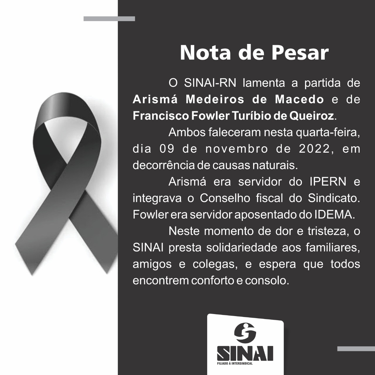 SINAI-RN emite nota de pesar pelo falecimento de dois trabalhadores de sua base 9 de novembro de 2022 / Gerais