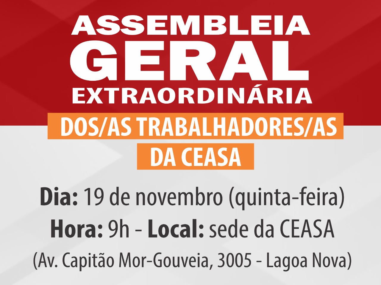 A direção estadual do SINAI-RN está convocando os/as trabalhadores/as da Ceasa para mais uma Assembleia Geral Extraordinária. O encontro está marcado para 19 de novembro (quinta-feira), às 9h, na sede da empresa, na Av. Capitão Mor-Gouveia, 3005 – Lagoa Nova.